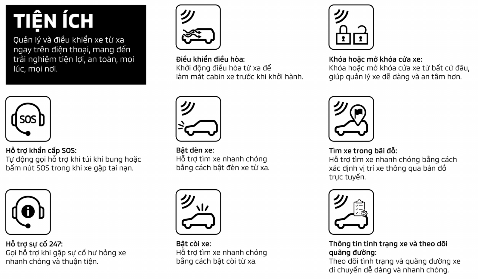 Yêu cầu hỗ trợ khẩn cấp khi xảy ra tai nạn hoặc tình huống nguy hiểm, chỉ cần bấm nút “SOS” trên trần xe để kết nối với tổng đài Hỗ trợ khẩn cấp 247. Trong trường hợp tai nạn và bung túi khí, hệ thống trên xe sẽ tự phát hiện và kết nối với tổng đài Hỗ trợ Khẩn cấp 247.
