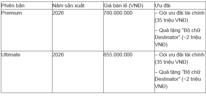 Bên cạnh đó, Mitsubishi Destinator được bán với giá 780 triệu đồng cho bản Premium 2026 và 855 triệu đồng cho bản Ultimate 2026, đóng vai trò mẫu SUV cao cấp trong danh mục sản phẩm Mitsubishi tại thị trường Việt Nam. Hai mẫu này cũng đang nhận được ưu đãi gói tài chính trị giá 35 triệu đồng.