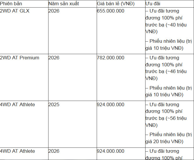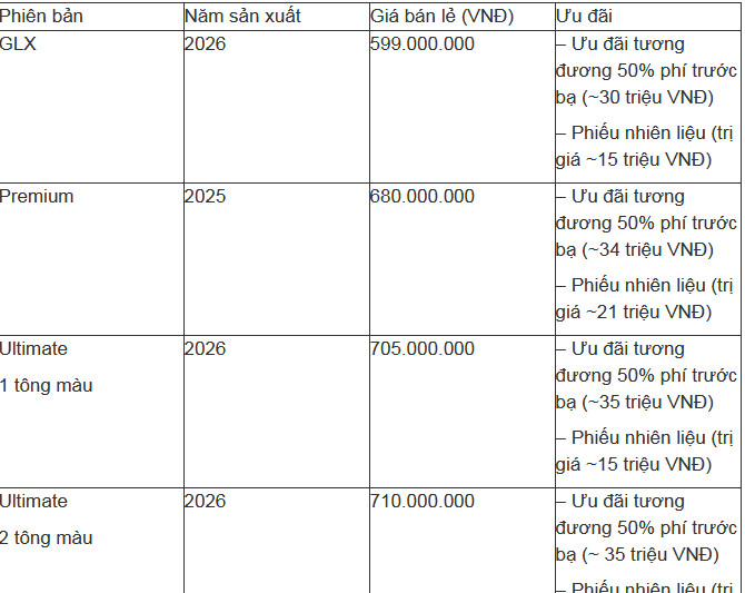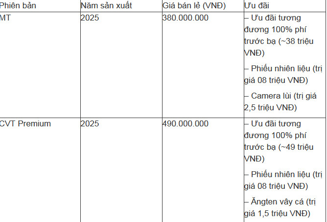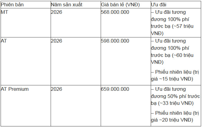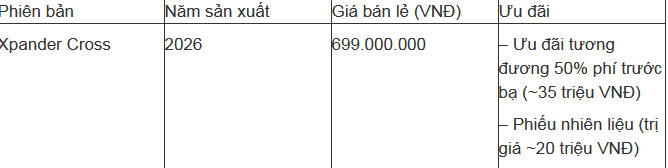 Trong nhóm MPV phổ thông, New Mitsubishi Xpander được bán từ 568 triệu đồng cho bản MT-CKD 2024, 598 triệu đồng cho bản AT-CKD 2025 và 659 triệu đồng cho bản AT Premium MY26 2025. Ngoài ra, phiên bản mang phong cách SUV là New Mitsubishi Xpander Cross được niêm yết 699 triệu đồng. Hiện 2 dòng này cũng đang được ưu đãi tới 100% phí trước bạ kèm quà tặng tùy loại.